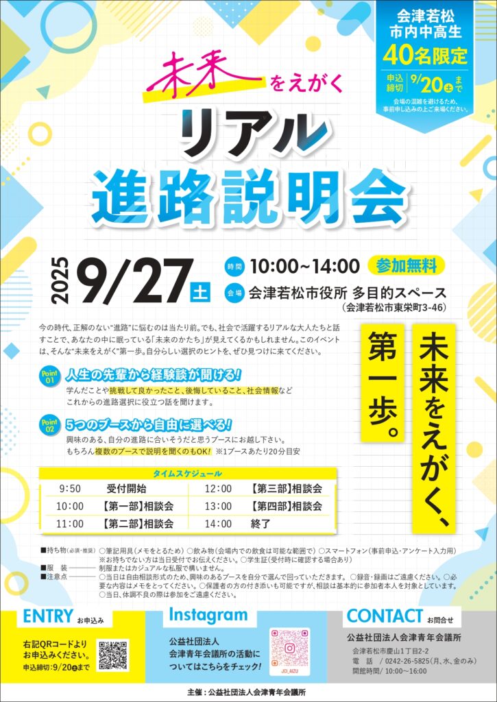 会津青年会議所は、中高生が具体的な将来ビジョンを描けるようになることを目的に、メンバーが実体験を共有し進路相談を行う、リアル進路相談を以下の通り開催させていただきます。参加希望の方に置かれましては下記URLからお申込みいただければと思います。お申し込み後に当日ブース対応を行う者の履歴書をお送りさせていただきます。個別に予約を取ることも可能なのでご希望がございましたら、履歴書を送付させていただいたアドレスまでご希望をご連絡いただきますようお願いいたします。